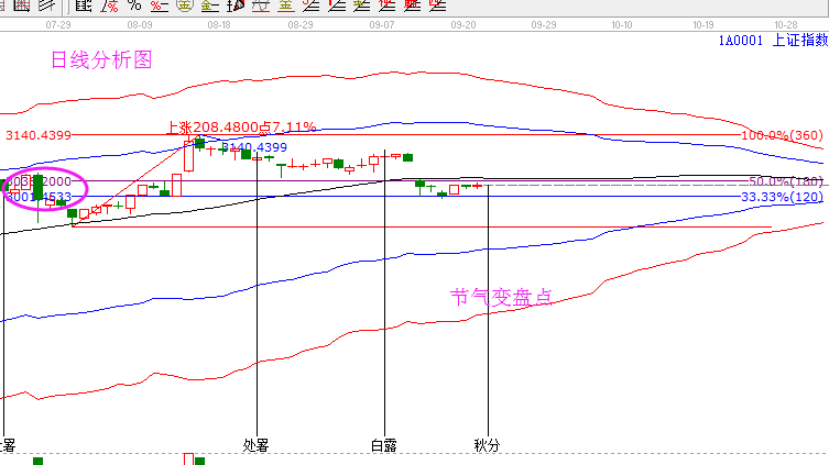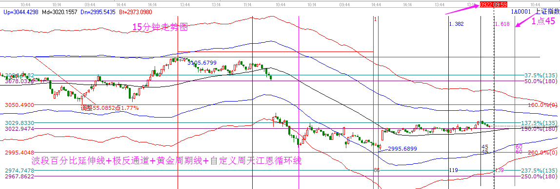 當(dāng)下大盤預(yù)測分析:先看日線分析圖:1趨勢仍在生命線下方相對較弱,未能上線操作上不宜激進(jìn);2價格上3001點是3分位的支撐反彈,當(dāng)前3036是50%+生命線3040壓力,放量突破壓力則轉(zhuǎn)化為支撐,拿下缺口再謀3150。這里成交量是關(guān)鍵,上不去還會繼續(xù)震蕩洗盤。3時間上今日22號是日內(nèi)窗口,美聯(lián)儲不加息對市場有短期刺激,但國慶長假臨近,市場短線或有方向選擇,但是不宜過分樂觀;看下2015年國慶后的走勢,對照當(dāng)下,9月30號1周年循環(huán),針對市場當(dāng)前位置,節(jié)后的好行情值得期待。再看下15分鐘圖,15分鐘底部出來我就提到過反彈空間看到3050,當(dāng)前生命線(3020)為日內(nèi)支撐,空間先看高到3050,一步步來。時間上借助黃金周期線和自定義周天循環(huán)線計算得出。