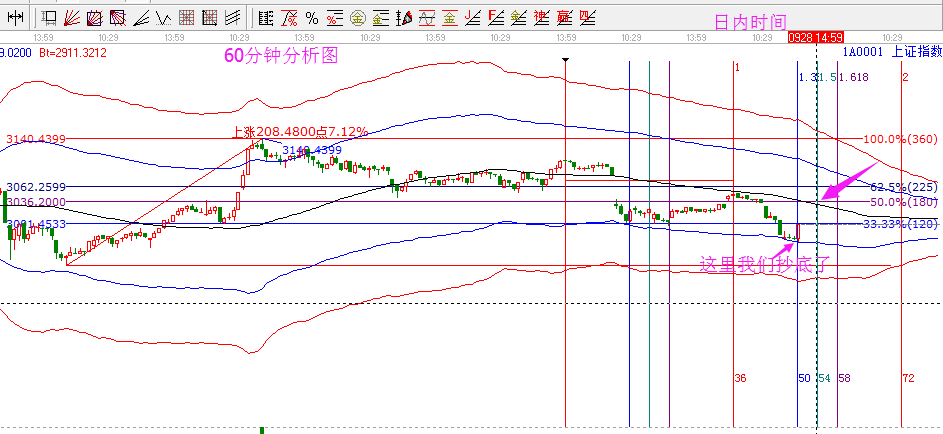 昨日分析及走勢(shì):昨日的早盤(pán)給出了2956-2973的抄底區(qū)間,并詳細(xì)的把每個(gè)周期的圖都做了說(shuō)明,都顯示此支撐區(qū)間的重要性。昨日全天都在考驗(yàn)2973的有效性,下午2點(diǎn)再度下探2973后小破跌倒2969后,我們追蹤了60分鐘走勢(shì)圖,在藍(lán)色下軌線(xiàn)獲得支撐,同時(shí),借助黃金周期線(xiàn)顯示2點(diǎn)進(jìn)入時(shí)間窗口,2點(diǎn)15緊急發(fā)帖提示抄底買(mǎi)入。呵呵,市場(chǎng)給力,截止尾盤(pán)拉回3000附近。遵照技術(shù)分析給出的信號(hào),每一次成功的買(mǎi)入和賣(mài)出,都給自己點(diǎn)贊,給技術(shù)點(diǎn)贊。上波3000-3050,我們落袋50點(diǎn);這波2970附近入場(chǎng),何時(shí)出場(chǎng)呢?敬請(qǐng)繼續(xù)關(guān)注本帖。