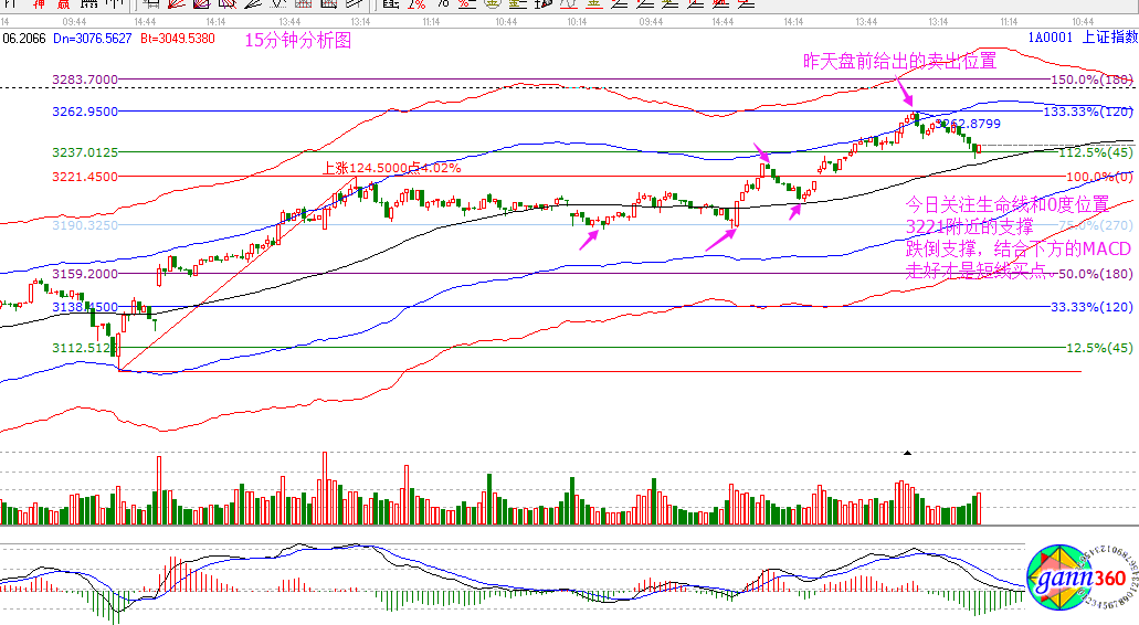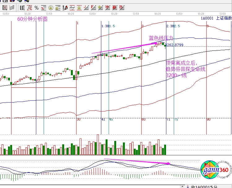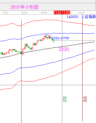 當(dāng)下大盤預(yù)測分析:3262的壓力昨天市場已經(jīng)表現(xiàn)出認(rèn)可,3262為日線百分比壓力點,同時15-30-60分的藍(lán)色外軌線也都提示了3262的壓力位,所以昨天的分析中我強(qiáng)調(diào)了此位置的重要性,大盤觸及此位置便快速回落。今天分享日線、15分、30分以及60分的圖,對照圖形來看。先看日線,28號是下個時間點,3262不能突破,震蕩整理不可避免,但是要確定此波上漲是否完全結(jié)束,待28日再定;再看短周期,15分鐘的回調(diào)已經(jīng)接近生命線,但是關(guān)注下方的MACD走勢,3220一線同樣是30分鐘生命線位置,則今日支撐重點關(guān)注3220,如在此位置止跌,且指標(biāo)走好,量能溫和放出,則支撐有效,是短線買點。60分鐘這里頂背離信號重點關(guān)注,若確定成立,則繼續(xù)降低倉位為主。