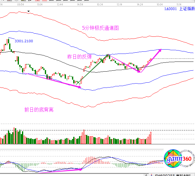 昨日分析及走勢: 昨日的分析里給出了各個周期的分析圖,提到5分鐘底背反彈 15分鐘反抽生命線3270的走勢,實則昨日高開后便上沖3270一線(最高3279),之后震蕩回落最終收于3274點。5分鐘極反通道圖(見下圖)剛好走了一波從藍色下軌線到藍色上軌線的反彈行情,15分鐘反擊生命線后在生命線展開震蕩。前日一根陰線快速下砸也代表了風(fēng)險的釋放,給出的支撐在3230附近,市場表現(xiàn)比預(yù)期的較為強勢,3239點止跌后,直接走了一波5分鐘的反彈。但,日線這里的調(diào)整并未結(jié)束,操作上,仍需保持謹慎。