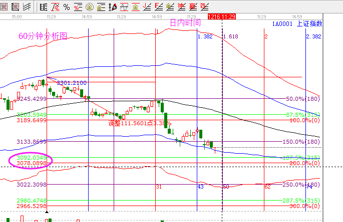 當下大盤預測分析:日線昨天盤中幾次打穿3116一線,最低探到3100附近,按照百分比操作規(guī)則。最后一個波段2分位打穿后,將會繼續(xù)下尋3分位【3301-(3301-2969)*66.67%】=3080。則本次調(diào)整的支撐區(qū)間繼續(xù)看3080-3116。下周一是時間點,則此區(qū)間形成底部的概率進一步增加。日內(nèi)分享一張60分鐘圖,3078為本次調(diào)整的波段百分比延伸1倍的位置,日內(nèi)時間關(guān)注上午10點半到11點半。