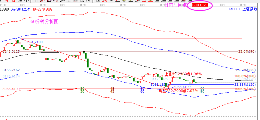 當(dāng)下大盤預(yù)測(cè)分析:2638-2807相連得出的上升趨勢(shì)線,當(dāng)前支撐點(diǎn)位在3078附近,今日日線依舊關(guān)注此位置,節(jié)后時(shí)間在1月5日附近。日內(nèi)分享60分鐘走勢(shì)圖,底背結(jié)構(gòu)形成后,震蕩構(gòu)筑 右肩,繼續(xù)反抽向生命線3118靠齊。以3301點(diǎn)作為起點(diǎn),做自定義周天360度計(jì)算調(diào)整時(shí)間,則今天上午10點(diǎn)半-11點(diǎn)半為90周天線,屆時(shí)關(guān)注盤面具體的量價(jià)關(guān)系。