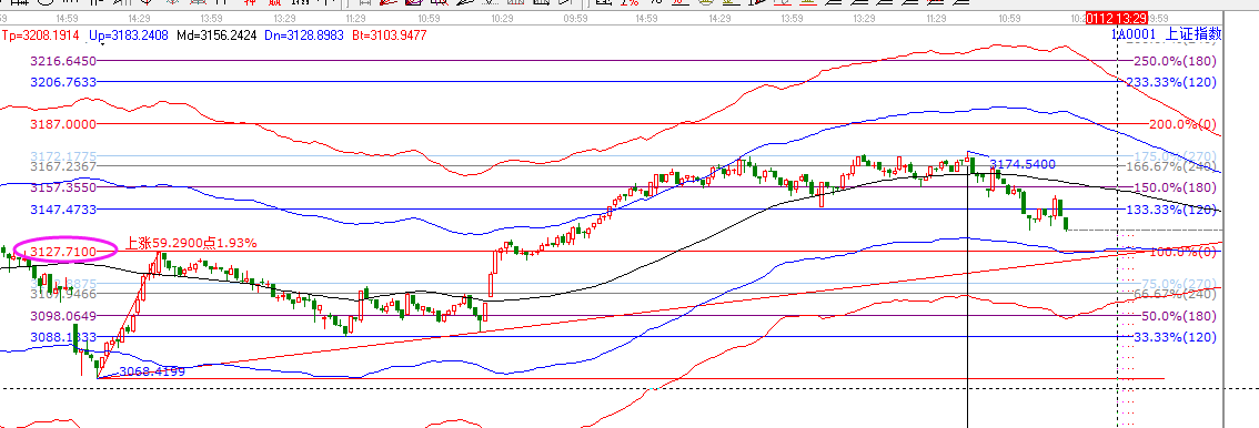 摘要: 當下大盤預測分析:日線生命線的壓力已經(jīng)成功引發(fā)了回調(diào),按照操作規(guī)則去做總是讓我們成為市場的幸運兒。生命線下市場繼續(xù)弱勢調(diào)整,不排除再度回踩趨勢線尋3068做雙底。短線支撐位,以3068為起點,3174為終點,做波段百分比分割,50%的位置在3121點,33.3%的位置在3103點。