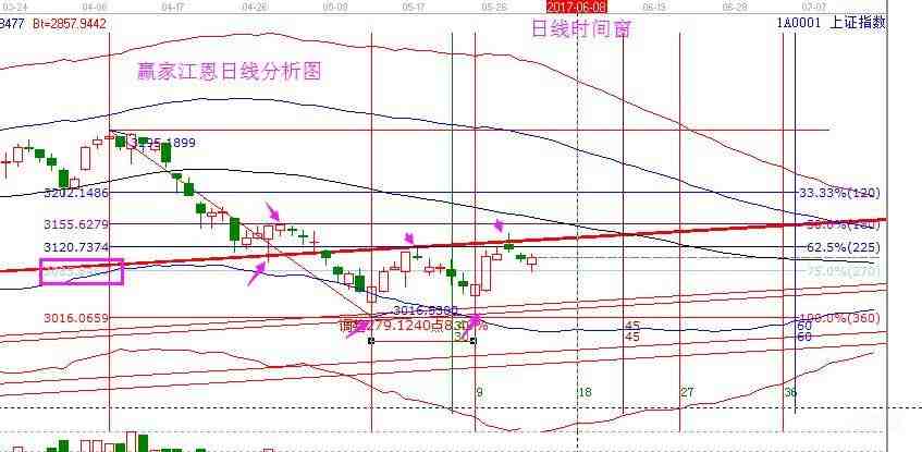 當(dāng)下大盤預(yù)測分析:對照日線分析圖,大盤仍在兩條角度線組成的時空通道中運(yùn)行,借助百分比找到更清晰的價(jià)格波動。3085為270度位置,3120為225度位置,紅色角度線壓力在3132處,日線