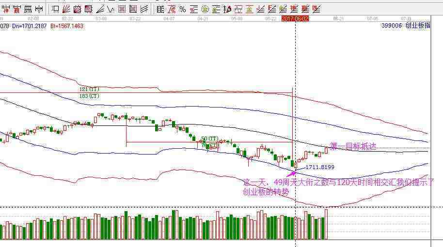 昨日分析及走勢(shì):今天貼一張創(chuàng)業(yè)板指數(shù)圖,及6月2日早盤點(diǎn)評(píng)中對(duì)創(chuàng)業(yè)板指數(shù)的點(diǎn)評(píng),49周天7個(gè)7重合的數(shù)字,易學(xué)中又稱大衍之?dāng)?shù),此重要時(shí)間接點(diǎn),創(chuàng)業(yè)板日線在藍(lán)色下軌線或支撐,有底背形態(tài),所以給出轉(zhuǎn)勢(shì)預(yù)期。實(shí)則市場(chǎng)就是如此給力,這就是自然法則,6月2號(hào)藍(lán)線轉(zhuǎn)勢(shì)后,按照極反通道規(guī)則,上漲目標(biāo)看高一線,則當(dāng)前已經(jīng)完美抵達(dá)生命線。藍(lán)線買,到了生命線,穩(wěn)妥期間先兌現(xiàn)利潤(rùn),若帶量突破生命線進(jìn)入強(qiáng)勢(shì)區(qū),繼續(xù)加大倉(cāng)位積極操作。交易系統(tǒng)化了,當(dāng)然也就簡(jiǎn)單明了,嚴(yán)格按照軟件技術(shù)信號(hào)執(zhí)行操作,賺錢難嗎?所有大盤分析均有留痕,有心想改變的,不防去翻一翻過往對(duì)大盤的分析,對(duì)照時(shí)間對(duì)照市場(chǎng)——計(jì)算概率,江恩這套技術(shù)行與不行,市場(chǎng)日日在驗(yàn)證!