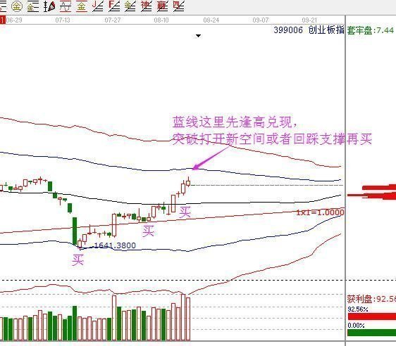 當(dāng)前具體操作要領(lǐng):日線及日內(nèi)各周期市場(chǎng)均在生命線上方強(qiáng)勢(shì)區(qū),則短線和小波段可積極開(kāi)展操作。震蕩攀升和單邊上行的行情對(duì)應(yīng)不同的操作,當(dāng)下定義為前者。震蕩攀升,個(gè)股為主,要選對(duì)板塊找對(duì)股,才能更好的把握效益。震蕩攀升,漲漲跌跌坐電梯很正常,所以要結(jié)合日內(nèi)短周期,做好高拋低吸。那么3280-85一線為當(dāng)前壓力點(diǎn),短線參考此位置不能強(qiáng)勢(shì)上攻,逢高減持也不用含糊,有了資金好股有的是再買別的就可以了。再說(shuō)下創(chuàng)業(yè)板,對(duì)照下面的圖,生命線站穩(wěn)后已經(jīng)如約來(lái)到了藍(lán)色外軌線1865附近,則不要追漲創(chuàng)業(yè)板,1865一線,手中相關(guān)個(gè)股結(jié)合阻力點(diǎn),注意逢高兌現(xiàn),藍(lán)線這里上不去,創(chuàng)業(yè)板會(huì)有回踩買入的低吸機(jī)會(huì),所以不要追。記住漲了是賣,跌了是買。