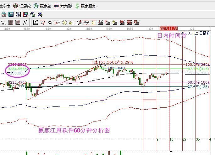 摘要: 當(dāng)下大盤預(yù)測(cè)分析:老規(guī)矩先看日線分析圖,回踩生命線后的反彈繼續(xù)震蕩上行,昨日小幅高開(kāi)的缺口未做回補(bǔ),截止收盤站在3263上方,一個(gè)臺(tái)階一個(gè)臺(tái)階來(lái),315度綠線的價(jià)位為3285附近, 日線再來(lái)一根陽(yáng)線,下方MACD則金叉在即,當(dāng)然量能仍需持續(xù)才會(huì)更有效的保持上漲的力度。再看日內(nèi)分析圖,5分鐘漂亮的強(qiáng)勢(shì)上行通道,生命線3260點(diǎn),紅線3283附近;15分鐘生命線3253,藍(lán)線3280,,日內(nèi)時(shí)間指向上午11點(diǎn)15分;30分鐘百分比支撐3253,壓力3279,日內(nèi)時(shí)間指向下午2點(diǎn)半;60分鐘站回生命線326