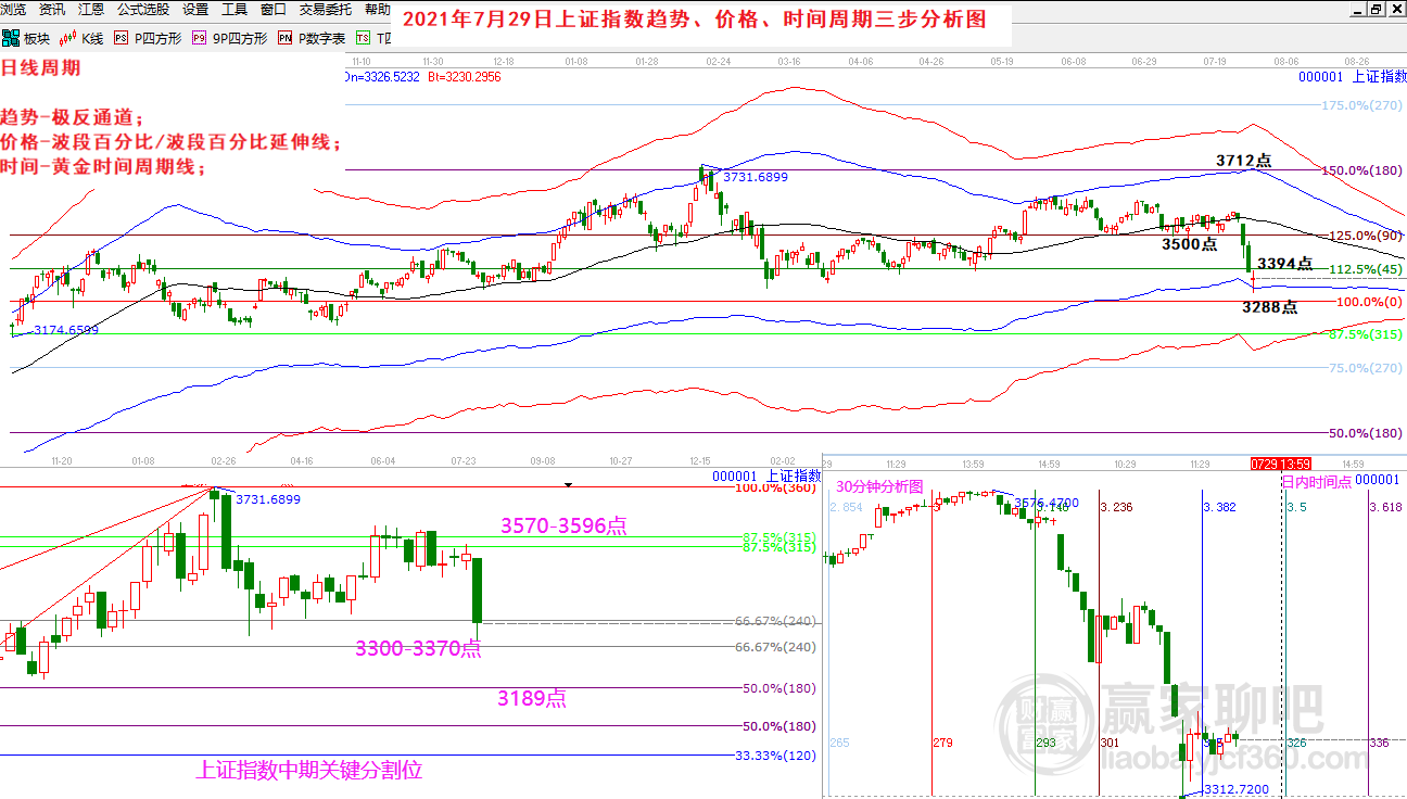 1、趨勢:指數(shù)跌破生命線,趨勢轉(zhuǎn)弱。未來行情時空推演,滬指23號江恩時間窗口失守極反通道黑色生命線,四天時間下砸到藍(lán)色下軌線,而周線則跌破了生命線3430點(diǎn),7月中旬后的波段時間拐點(diǎn)下行力度較大,從波段角度上講,波段底構(gòu)建完成的時間重點(diǎn)放在9月份,7月中旬、9月中旬這兩個波段時間拐點(diǎn)在正式學(xué)員培訓(xùn)課做過多次解讀,如何判斷出來的可以查看視頻回放。暫不講下個波段窗口期間市場會如何,日線到達(dá)極反通道藍(lán)色下軌線,根據(jù)30余年指數(shù)99%重要拐點(diǎn)、次級別拐點(diǎn)均在極反通道的五條線處,當(dāng)前藍(lán)色下軌線會有反彈,但這里不是反轉(zhuǎn),從時間、空間均不支持,因此不用擔(dān)心會錯過行情,分鐘圖反抽注意3400附近反壓。