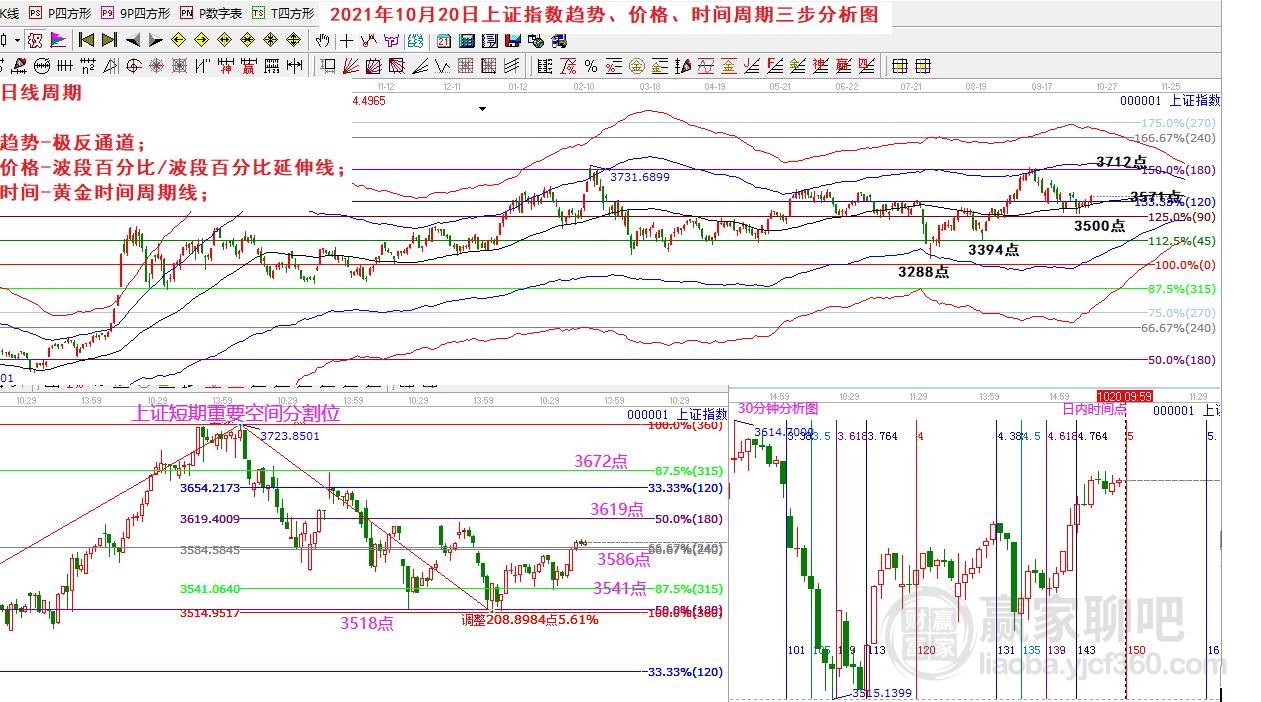 1、趨勢:指數生命線附近,趨勢強勢。21號是10月第二個日線級別時間窗口,25號是江恩輪波段時間窗口,前面分析中預判日線時間會先做出選擇明確波段方向,結合江恩空間波動規(guī)則,滬指日K線在極反通道生命線強勢區(qū),未來路徑推演圖查看9月30號《大盤路徑圖預判》以及10月18號《臨近方向選擇關鍵期》。20號及21號盤中跟蹤江恩箱下降2*1線與江恩百分比270度共振壓力3621點,遇壓力后預期還有再度確認生命線的動作,屆時時間將進入江恩輪變盤周,保持在線上未來路徑就只參考9月30號預判。