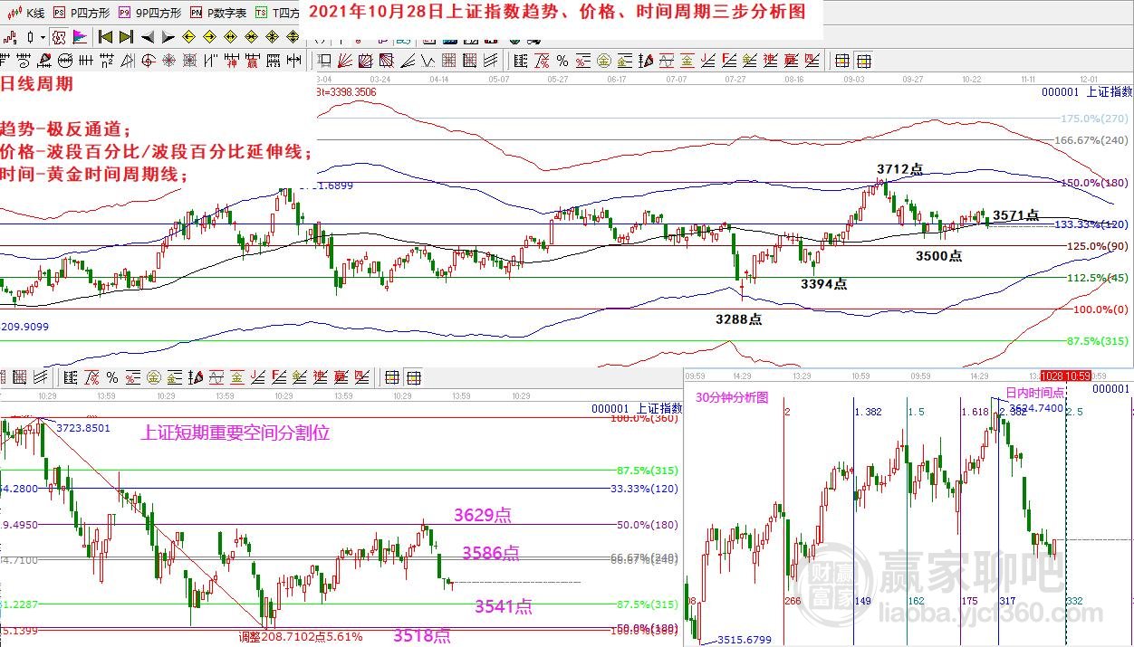1、趨勢:指數(shù)生命線附近,趨勢強勢。26號日K線上攻江恩箱2*1線3614點未能站穩(wěn),27號低開收盤失守極反通道黑色生命線3575點,按前期預(yù)判,突破站上2*1線代表波段趨勢轉(zhuǎn)強,日線在2*1線下運行走震蕩(更細致劃分日生命線上強勢震蕩,線下弱勢震蕩),本周后兩個交易日觀察能否收復(fù)生命線,如在生命線下運行走弱勢震蕩,鑒于周線生命線3500有強支撐,回探的空間有限。對未來走勢預(yù)判可參考10月18號《臨近方向選擇關(guān)鍵期》分析中的路徑圖。日內(nèi)而言,早盤跟蹤3575--3585區(qū)間,不能收復(fù)還有再度下探動作。