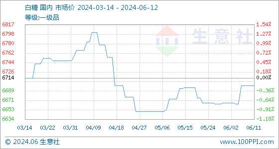6月12日生意社白糖基準價為6700.00元/噸