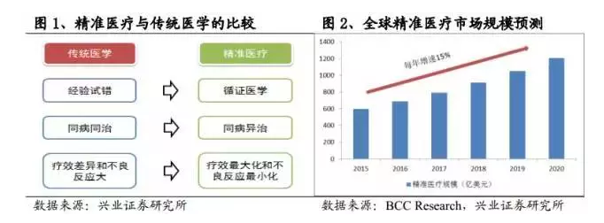 根據(jù)BCC Research預(yù)測(cè),2015年全球精準(zhǔn)醫(yī)療市場(chǎng)規(guī)模近600億美元,今后5年年增速預(yù)計(jì)為15%,是醫(yī)藥行業(yè)整體增速的3至4倍。精準(zhǔn)醫(yī)療是醫(yī)療健康時(shí)代的產(chǎn)物,是未來(lái)生物醫(yī)藥產(chǎn)業(yè)發(fā)展的確定性趨勢(shì),基因測(cè)序作為精準(zhǔn)醫(yī)療的基石,有望引領(lǐng)行業(yè)持續(xù)向上和繁榮。
