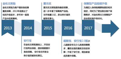 數(shù)據(jù)來源:公司報(bào)告,安信證券研究中心 以中國太保為例,保障型產(chǎn)品體系不斷升級完善。從2013年的金佑主附險(xiǎn)、2014年的安行寶、2015年的愛無憂、以及2016年的超能寶、安行寶2.0,公司在開發(fā)新產(chǎn)品的同時(shí),陸續(xù)對保障型產(chǎn)品進(jìn)行升級,產(chǎn)品體系日益全面。