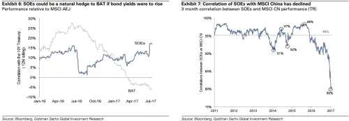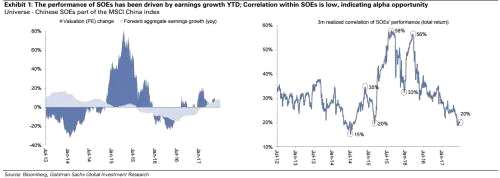 高盛 在研報(bào)中分析認(rèn)為,目前包含在MSCI中的SOE與MSCI中國(guó)指數(shù)的相關(guān)性在2017年已經(jīng)下降到80%,而5年平均值為95%,明顯偏低。盡管導(dǎo)致SOE與指數(shù)相關(guān)性走低的部分原因是BAT股票的崛起,但這也同時(shí)反應(yīng)出相比較除科技巨頭公司外的民營(yíng)企業(yè),SOE的整體業(yè)績(jī)貢獻(xiàn)仍偏低,僅10%。因此 高盛 表示,SOE股價(jià)的分裂狀況恰恰意味著α機(jī)會(huì)的出現(xiàn)。