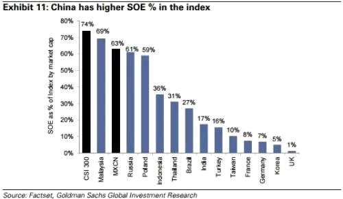 此外, 高盛 在研報(bào)中還指出,就其覆蓋的750余家上市國(guó)企公司,綜合 總收入 近5.1萬(wàn)億美元,2016年的市值占所有上市國(guó)企的54%, 總收入 的72%。此外,中國(guó)的國(guó)企占滬深300指數(shù)74%的總市值,占據(jù)MSCI中國(guó)指數(shù)63%的總市值。這比其他國(guó)家上市國(guó)企在指數(shù)份額的占比要高得多,俄羅斯61%,波蘭59%,印度尼西亞36%,巴西27%,印度17%,德國(guó)7%,英國(guó)僅1%。