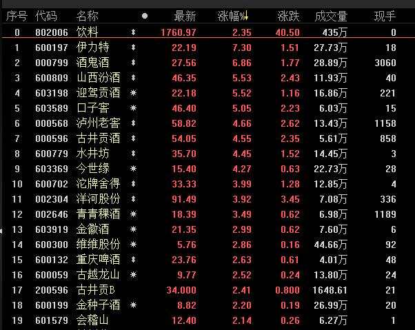 當(dāng)然,小編似乎跑題了,還是回歸白酒板塊,在眾目睽睽之下,也的確不負(fù)眾望。截止收盤,飲料行業(yè)漲幅居前,伊力特(600197) 、酒鬼酒(000799)、山西汾酒(600809) 、口子窖等漲逾5%;瀘州老窖(000568) 、水井坊(600779) 、古井貢酒(000596) 等都有不同程度漲幅。