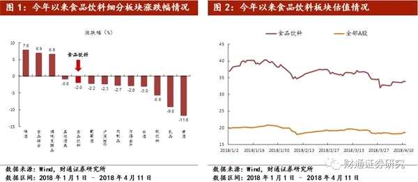 一季度食品飲料板塊市場表現(xiàn)相對靠后,按照流通市值加權(quán)計(jì)算,今年以來(截至4月11日)板塊整體跌幅2.0%,跑輸滬深300(-2.3%)及萬得全A(-2.8%)。今年以來(截至4月11日)板塊整體估值從年初的36.9倍下降到33.9倍,下降幅度8.1%。板塊整體表現(xiàn)相對去年有所弱勢。