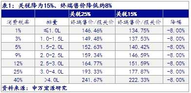 與此同時(shí),券商分析師也給出了“定量”分析,申萬(wàn)宏源(000166,股吧)表示,從稅率分析表可見,關(guān)稅15%時(shí),終端總稅率較目前總稅率降幅14%-25%,終端總售價(jià)降幅8%。根據(jù)整車廠商和經(jīng)銷商的價(jià)格調(diào)整策略不同,預(yù)計(jì)消費(fèi)者會(huì)享受到4%-8%的價(jià)格優(yōu)惠。