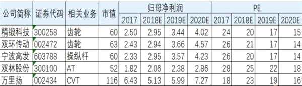 自動變速器產(chǎn)業(yè)鏈相關(guān)公司將充分受益。(1)自動變速器齒輪企業(yè):不僅受益自主品牌自動變速器滲透率提升,同時大力發(fā)展合資品牌客戶,業(yè)績持續(xù)較快增長,推薦精鍛科技(300258,股吧)、雙環(huán)傳動(002472,股吧)。(2)自動變速器操縱桿企業(yè):受益自主品牌自動變速器滲透率的提升,產(chǎn)品升級,單車價值提升,實現(xiàn)業(yè)績較快增長,推薦寧波高發(fā)(603788,股吧)。(3)自動變速器總成企業(yè):單車價值高,短期受益自主品牌自動變速器滲透率提升,長期有望產(chǎn)業(yè)整合,出現(xiàn)中國的“愛信”、“采埃孚”,推薦雙林股份(300100,股吧)、萬里揚(002434,股吧)。