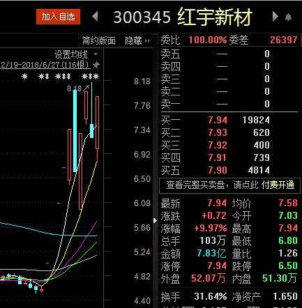 紅宇新材自6月13日復(fù)牌之日起,10個交易日將8個漲停板收入囊中,值得一提的是,6月22日,紅宇新材更是演繹了從跌停到漲停的奇跡,上演“地天板”,當(dāng)天換手率高達(dá)24.09%,量比為2.05倍。