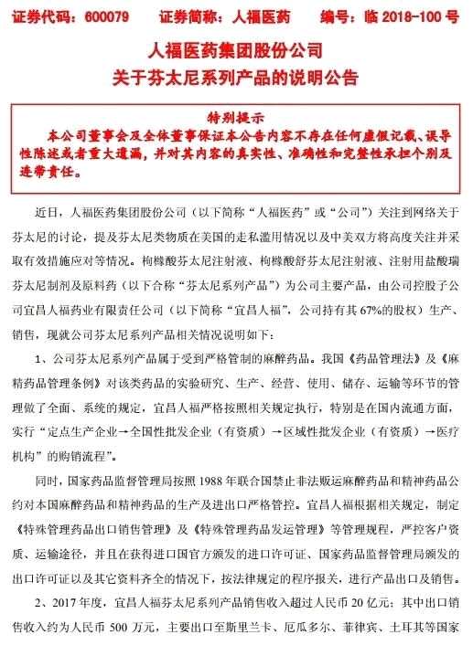人福醫(yī)藥(600079)發(fā)布澄清公告稱,子公司宜昌人福2017年芬太尼系列產(chǎn)品銷售收入超過20 億元,但沒有任何相關(guān)產(chǎn)品出口到美國。