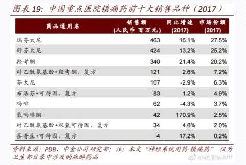 中金公司統(tǒng)計數(shù)據(jù)顯示,2017年中國重點醫(yī)院陣痛藥前十大銷售品種中,芬太尼類藥品占比接近60%。