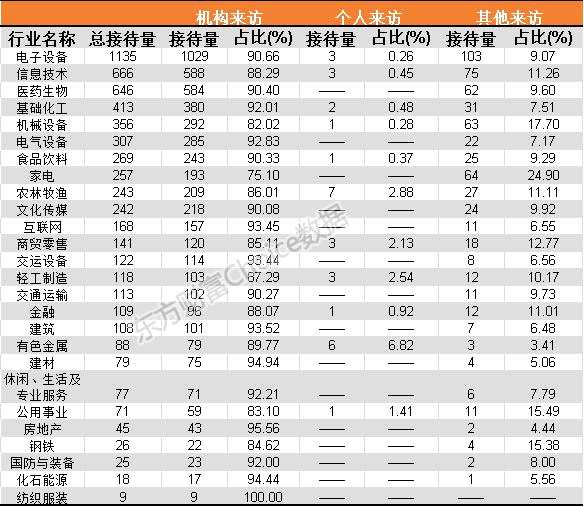 小編根據(jù)數(shù)據(jù)顯示,從所屬東財(cái)行業(yè)(一級(jí)行業(yè))來看,近一個(gè)月(11月1日至11月30日),各個(gè)行業(yè)之中,電子設(shè)備總接待量最高,達(dá)到1135次,其中包括機(jī)構(gòu)接待量1029次、個(gè)人來訪接待量3次,其他來訪接待量103次。但就機(jī)構(gòu)來訪接待量來看,行業(yè)板塊的熱度出現(xiàn)斷層現(xiàn)象,除了電子設(shè)備有達(dá)到上千家機(jī)構(gòu)來訪之外,信息技術(shù)以及醫(yī)藥生物的機(jī)構(gòu)來訪接待量超5百次,其次為基礎(chǔ)化工、機(jī)械設(shè)備、電氣設(shè)備以及食品飲料來訪量逾200次。