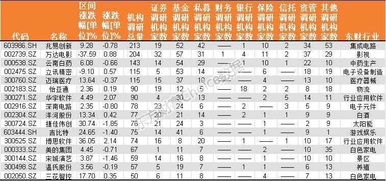 除了兆易創(chuàng)新之外,萬達(dá)電影也吸引了逾兩百家以上機(jī)構(gòu)的目光;此外,有3家上市公司同樣獲得超百家機(jī)構(gòu)青睞,分別是:云南白藥、立訊精密以及邁瑞醫(yī)療。