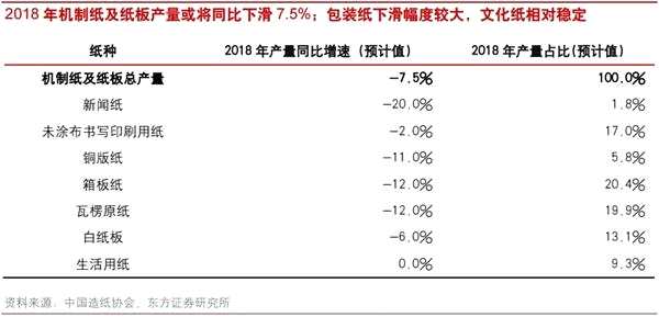 2018年1-10月機制紙及紙板累計產量同比下滑8.4%,需求疲軟是主因。分紙種而言,箱板瓦楞紙產量同比下滑幅度較大,雙膠紙、生活用紙則相對穩(wěn)定。東方證券認為,2019年,原材料端價格走勢與需求變化高度相關,如需求繼續(xù)疲弱,預計廢紙價格將大概率呈向下走勢,漿價走勢則取決于全球宏觀經濟變化帶來的需求波動。外廢價格受廢紙進口需求持續(xù)下滑影響預計將向下調整;需求走弱背景下,國廢供應充足,2019年國廢價格將橫盤震蕩或下跌;2019年木漿新增供給有限,策考慮到需求端與全球宏觀經濟波動相關,存在不確定性,預計2019年木漿略價格將震蕩持平或向下。