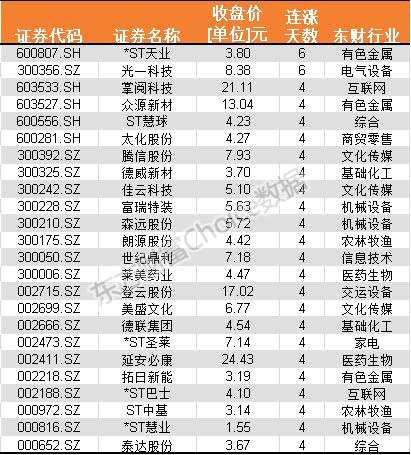 另外,小編根據(jù)數(shù)據(jù)顯示,在上述43只漲停股之中,連漲天數(shù)達(dá)4天(含4天)以上的個(gè)股有24只,主要集中于有色金屬、基礎(chǔ)化工、文化傳媒、機(jī)械設(shè)備等行業(yè)。