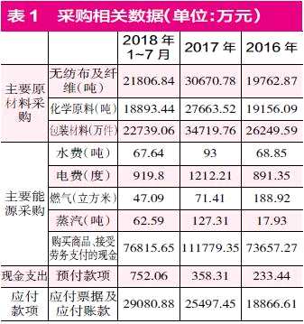 并購草案披露了諾斯貝爾2016年至2018年前七個月主要原材料(無紡布及纖維、化學(xué)原料、包裝材料)和主要能源(水、電、燃?xì)?、蒸?的采購情況,將其各項金額相加后可得到2016年采購總額大體為66335.6萬元、2017年采購總額大體為94557.99萬元、2018年前七個月采購總額大體為64536.46萬元??紤]到17%增值稅率的影響,則2016年至2018年前七個月的含稅采購總額分別為77612.65萬元、110632.85萬元和75507.66萬元。