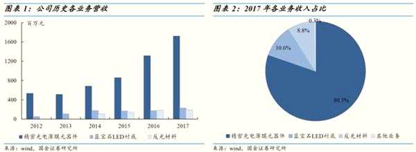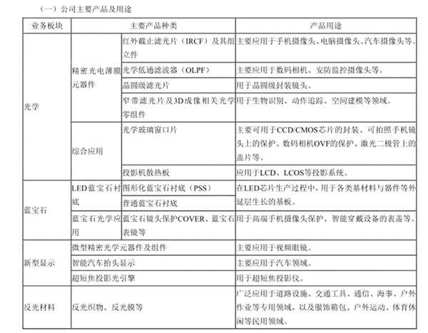 公司主營業(yè)務(wù)可以分為四類:光學(xué)、藍(lán)寶石、反光材料以及包括新型顯示的其他業(yè)務(wù)等。收入占比分別是:精密光電薄膜元器件80%;藍(lán)寶石襯底10.6%;反光制品8.79%;其他:0.26%。