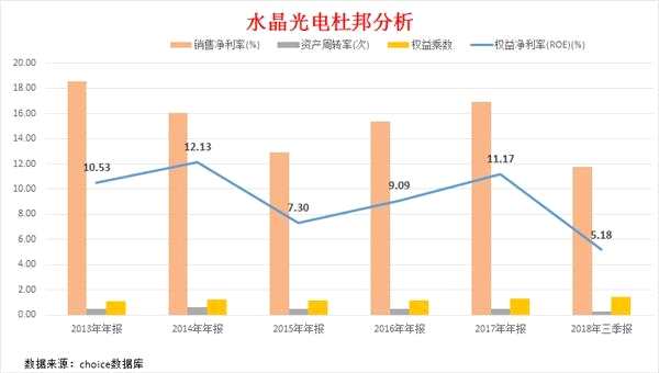 水晶光電近年來的凈資產(chǎn)回報率不高,始終在10%上下,符合消費電子的平均水平,但低于優(yōu)秀同行。18年Q3由于一筆投資收益導(dǎo)致凈利潤率上漲,使得18年的ROE有所上升,剔除后,ROE大約為5.18%,數(shù)據(jù)偏低。