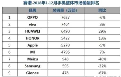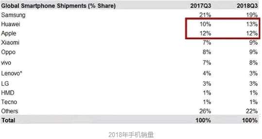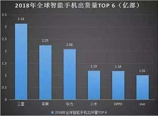 2018年頭部手機(jī)供應(yīng)商全球出貨10.85億部,其中三星位列第一3.14部,其次是蘋果銷量2.25億,華為銷售量第一次突破2億。小米、OPPO、VIVO均有小幅增長。