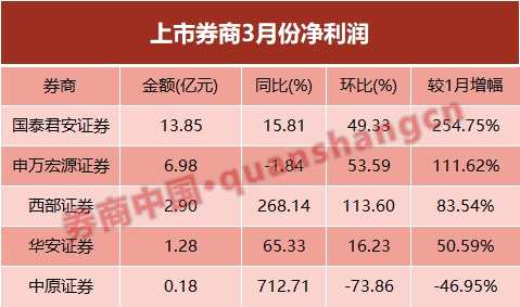 西部證券3月份凈利潤環(huán)比增幅達到113%,國泰君安和申萬宏源單月凈利潤環(huán)比增幅50%左右,另外,華安證券凈利潤環(huán)比增加16%。