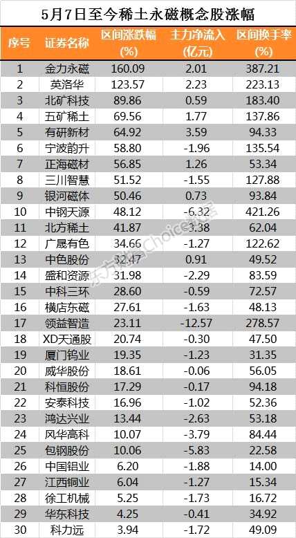 而5月7日至今,以金力永磁、英洛華為代表的稀土個(gè)股漲幅驚人,但值得注意的是,主力大單資金凈流入并不是很高,而區(qū)間換手率部分個(gè)股高達(dá)卻已經(jīng)超200%-400%之間,表明游資接力炒作意味濃厚,小編在此提醒投資者需注意回落風(fēng)險(xiǎn)。