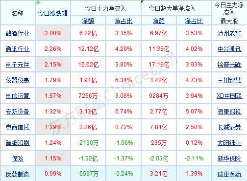 從盤面上來看,行業(yè)與概念板塊漲跌不一。在行業(yè)板塊之中,釀酒行業(yè)、通訊行業(yè)、電子元件等板塊漲幅居前;而在概念板塊之中,5G概念、國產芯片、超級真菌、電子煙等板塊漲幅靠前。