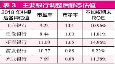 調(diào)整完凈利潤后,還需要調(diào)減各家銀行的凈資產(chǎn)。由于補扣減值在減少當(dāng)期凈利潤的同時也減少了每期積累的凈資產(chǎn),所以在后面進行估值調(diào)整的時候會影響到市凈率和期末ROE,計算過程和上面類似,也要考慮扣稅的問題。經(jīng)過調(diào)整后,幾家銀行的靜態(tài)估值如表3所示。