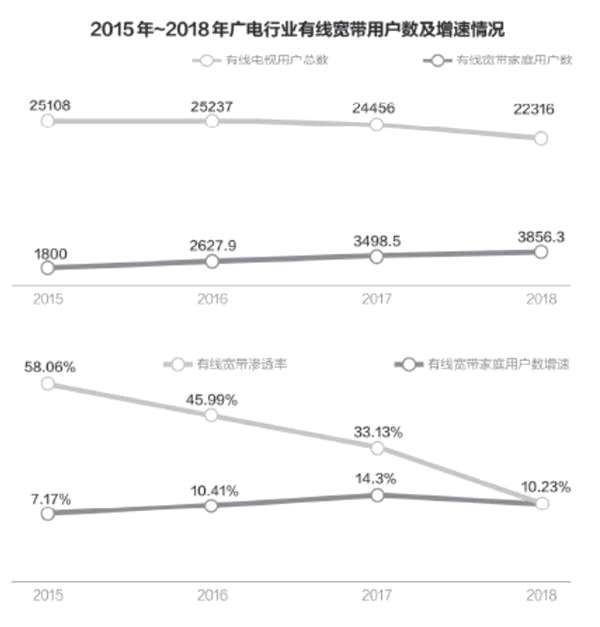 截至2018年年末,廣電有線寬帶用戶達(dá)到3856.3萬戶,相較2017年凈增357.8萬戶,而目前三大運(yùn)營商的寬帶用戶量已近4億。