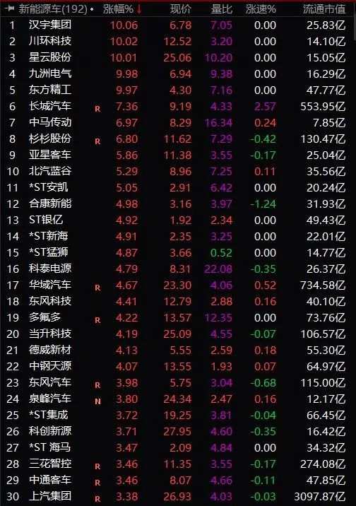 受上述消息影響,A股市場新能源汽車板塊集體異動(dòng),板塊指數(shù)迅速翻紅,并呈現(xiàn)直線拉升,盤中漲幅一度超過2%。早盤多達(dá)14只股票觸及漲停,截至券商中國發(fā)稿,【漢宇集團(tuán)(300403)、股吧】、川環(huán)科技、星云股份、九洲電氣、東方精工等漲停,中馬傳動(dòng)、亞星客車、北汽藍(lán)谷、杉杉股份等漲逾5%。