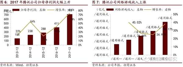 2017Q2,《王者榮耀》助力騰訊手游市占率突破50%。隨著騰訊在手游行業(yè)的布局深入,公司游戲業(yè)務(wù)快速增長,騰訊在頭部游戲上的優(yōu)勢逐漸明顯。2017Q2公司在手游行業(yè)的市占率已提升至51.8%,形成壟斷優(yōu)勢。2017騰訊公司營業(yè)總收入2380億元,同比增長56%,歸母凈利潤715億元,同比增長74%。網(wǎng)絡(luò)游戲業(yè)務(wù)實現(xiàn)收入978.83億元,同比增長38.2%。