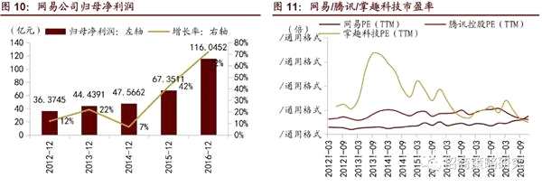 網(wǎng)易手游在14Q4-16Q2期間崛起。14Q4-16Q2期間,網(wǎng)易手游業(yè)務(wù)崛起,游戲業(yè)務(wù)同比增速位于36.1%~76%。在手游業(yè)務(wù)的帶動下,網(wǎng)易公司在15年的營業(yè)總收入為228億,較14年的117億同比上漲95%;16年為382億,同比上升67%;公司14/15/16年的歸母凈利潤分別為48/67/116億,同比增長率為7%/42%/72%,上升趨勢明顯。