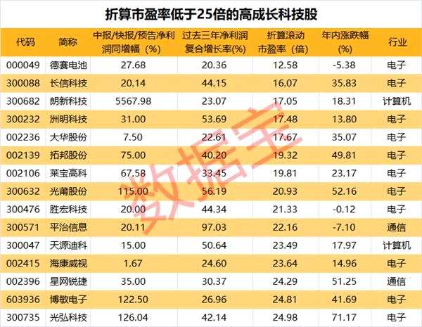 另外,光莆股份、平治信息、天源迪科折算市盈率超過20倍,但3股過去三年凈利潤復(fù)合增速較高,均超50%。從年內(nèi)市場(chǎng)表現(xiàn)來看,以上15股中有5只年內(nèi)跑輸大盤,分別是平治信息、德賽電池、勝宏科技、洲明科技及??低暋?/p>