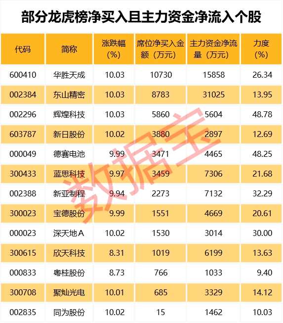 從盤口資金流向來看,主力資金凈流入超千萬且龍虎榜凈買入個(gè)股共有13只,其中東山精密、華勝天成、藍(lán)思科技等個(gè)股資金凈流入金額最大。凈流入力度最大的個(gè)股有輝煌科技、德賽電池、新亞制程,凈流入力度分別為48.78%、48.25%、32.29%。