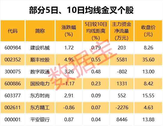 截至7月24日收盤,有7只A股的5日均線主動(dòng)上穿10日均線,其中建設(shè)機(jī)械、順豐控股、數(shù)字政通等個(gè)股的5日均線較10日均線距離最大,分別達(dá)0.79%、0.55%、0.48%。