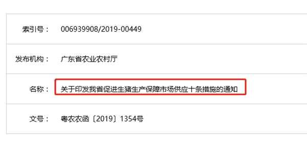 摘要: 據(jù),7月25日,廣東省農(nóng)業(yè)農(nóng)村廳官方網(wǎng)站公布《關(guān)于印發(fā)我省促進(jìn)生豬生產(chǎn)保障市場(chǎng)供應(yīng)十條措施的通知》(簡(jiǎn)稱《通知》)。這份編號(hào)為粵農(nóng)農(nóng)函〔2019〕1354號(hào)、由廣東省12個(gè)部門聯(lián)合印發(fā)出臺(tái)的《通知》要