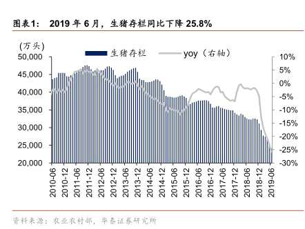 根據(jù)農(nóng)業(yè)農(nóng)村部數(shù)據(jù):2019 年 6 月生豬存欄環(huán)比降低 5.1%,同比下降 25.8%;能繁母豬存欄環(huán)比下降 5.0%,同比減少 26.7%。生豬存欄同比數(shù)據(jù)來看,上輪周期同比下降最高幅度在 2015 年 3 月的 10.7%,目前的供應(yīng)下滑幅度遠(yuǎn)超上輪周期。