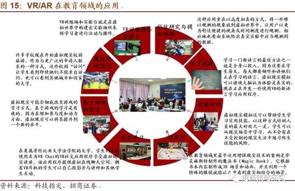 具體到應(yīng)用場(chǎng)景,例如在視頻游戲行業(yè),VR/AR將應(yīng)用到3D游戲、人機(jī)對(duì)戰(zhàn)、觀看虛擬現(xiàn)實(shí)影片等方面;在房地產(chǎn)行業(yè),VR/AR將應(yīng)用到可視化互動(dòng)體驗(yàn)、樣板間展示、城市規(guī)劃、科技園區(qū)等方面;在醫(yī)療行業(yè),VR/AR將應(yīng)用到手術(shù)培訓(xùn)、治療疼痛、病人教育、戒煙甚至牙醫(yī)等方面;在教育培訓(xùn)行業(yè),VR/AR在語言沉浸、遠(yuǎn)程學(xué)習(xí)、虛擬校園訪問、技能培訓(xùn)等方面等方面有所應(yīng)用。