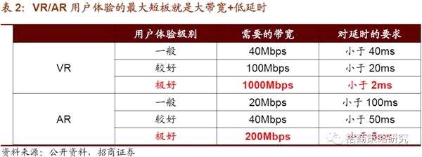 VR/AR是新一代信息技術(shù)相互融合的產(chǎn)物,高質(zhì)量VR/AR業(yè)務(wù)對(duì)帶寬、時(shí)延要求非常高,例如對(duì)于VR來說,要達(dá)到非常好的用戶體驗(yàn),需要的帶寬要達(dá)到1000Mbps以上,延時(shí)要達(dá)到小于2ms的級(jí)別,而對(duì)于AR來說要達(dá)到不錯(cuò)的用戶體驗(yàn)也需要200Mbps帶寬以上和5ms以下的延時(shí),這在4G時(shí)代是沒有辦法實(shí)現(xiàn)的,唯有5G能滿足這樣的高速傳輸能力。