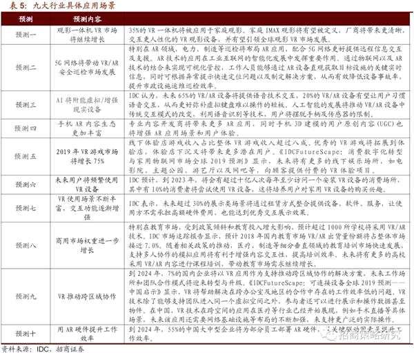 4G僅能夠滿足部分VR/AR應(yīng)用,因此5G時(shí)代的到來將拓展出全新的應(yīng)用場(chǎng)景。2月11日,IDC發(fā)布2019年VR/AR市場(chǎng)十大預(yù)測(cè)。IDC認(rèn)為,目前行業(yè)應(yīng)用正在進(jìn)一步展開和深入,細(xì)分領(lǐng)域消費(fèi)場(chǎng)景不斷得到豐富,VR終端市場(chǎng)逐漸向擁有更佳體驗(yàn)的中高端產(chǎn)品形態(tài)過渡,產(chǎn)業(yè)生態(tài)發(fā)展更加成熟。未來,技術(shù)革新與應(yīng)用將會(huì)成為VR/AR市場(chǎng)在2019年的重要發(fā)展趨勢(shì),新技術(shù)的成熟和普及將為市場(chǎng)的持續(xù)增長(zhǎng)賦能。內(nèi)容生態(tài)依然是行業(yè)整體進(jìn)步的關(guān)鍵,未來將會(huì)有更多的產(chǎn)業(yè)領(lǐng)域向VR/AR技術(shù)設(shè)備提供商以及內(nèi)容制作商伸出橄欖枝。IDC預(yù)測(cè),至2023年,商用領(lǐng)域的應(yīng)用場(chǎng)景中,支出規(guī)模最大的依次為培訓(xùn)(27.5億美元)、零售展示(21.4億美元)和工業(yè)維修(16.2億美元)。而在消費(fèi)領(lǐng)域,3個(gè)應(yīng)用場(chǎng)景(VR游戲、AR游戲、VR視頻)的支出規(guī)模預(yù)期將于2023年達(dá)到95.9億美元。在預(yù)測(cè)期內(nèi)(2018-2023年),有14個(gè)應(yīng)用場(chǎng)景的5年CAGR將超過100%,其中增長(zhǎng)最快的為AR游戲、解剖學(xué)診斷以及虛擬測(cè)試驅(qū)動(dòng)。